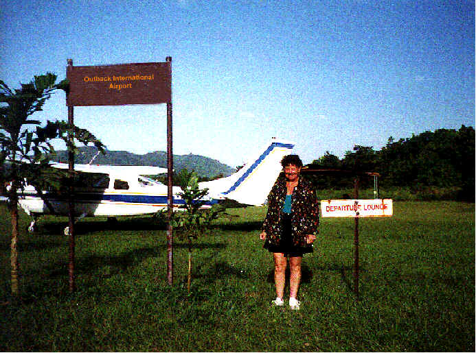 Barbara at the departure lounge in Australia.We knew that the trip was done on a shoe string but this is taking it to extremes.